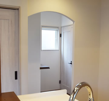 屋根瓦やかわいらしいアーチを用いたエントランスの扉を開くと、アーチをもつ小さなニッチ(飾り棚)が迎えてくれます。