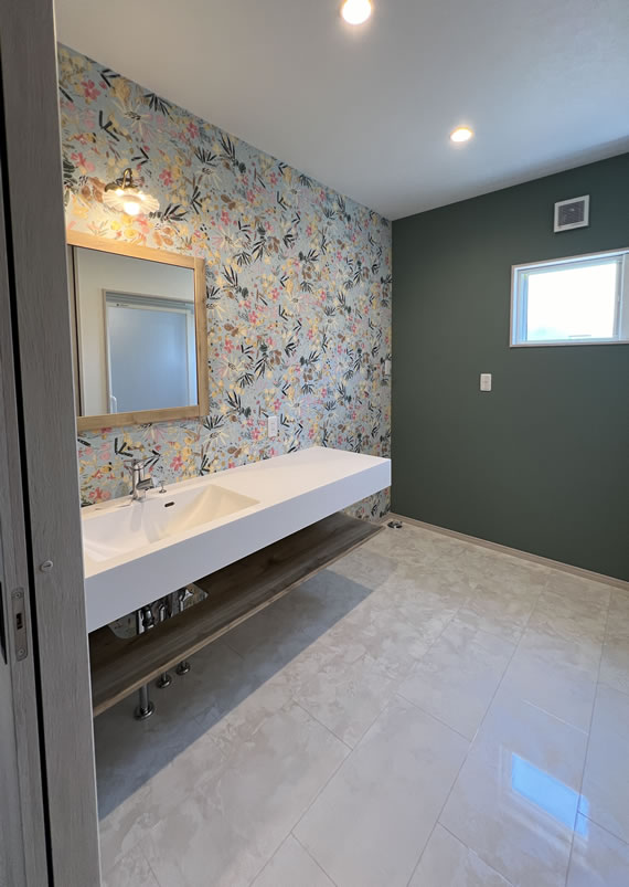 洗面室・脱衣室にも天井までの造り付けの収納を設けました
